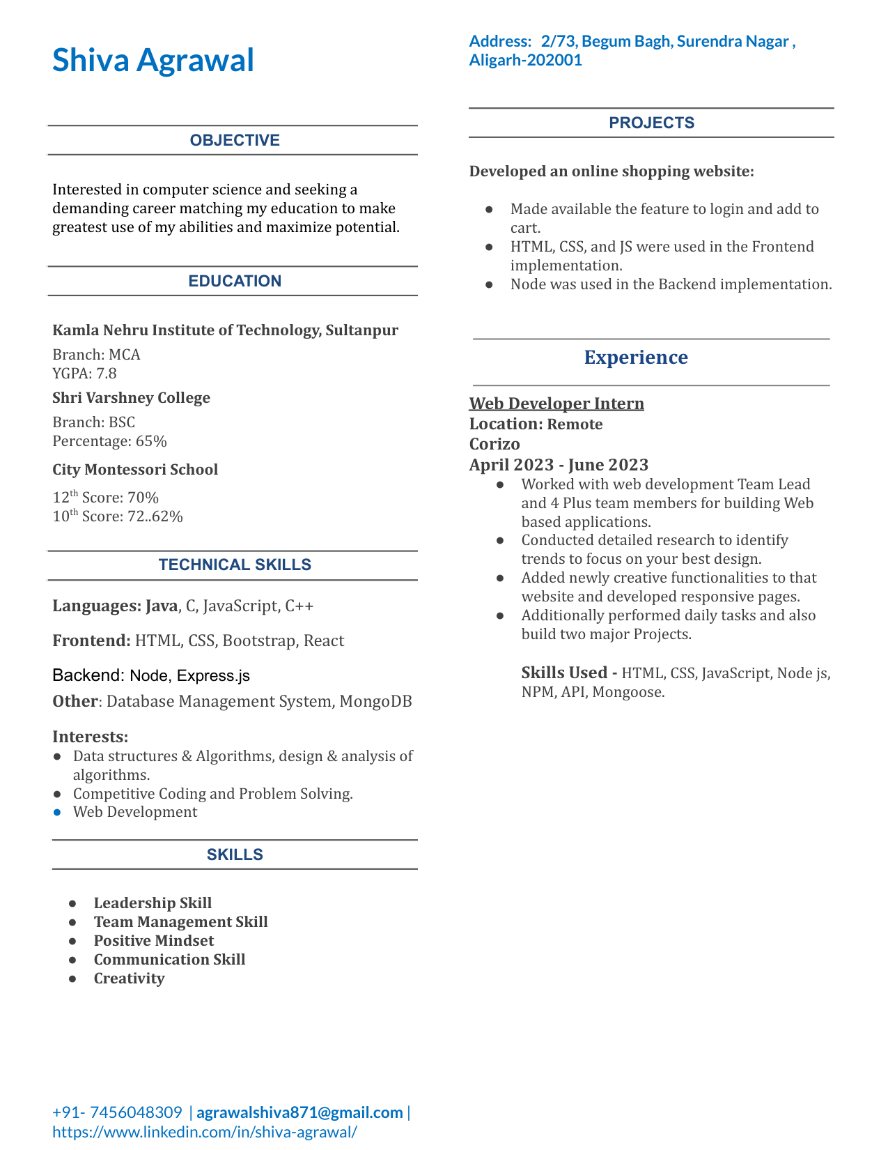 I'm a Master of Computer Science student from KNIT Sultanpur with excellent academic background and diverse skillset. Experienced in Web development. I am well versed with Node.js, Java, C and C++ programming languages. and basics of Javascript, HTML and CSS. I have strong programming skills and problem solving abilities. My area of interest to includes Data structure and Algorithm.